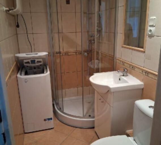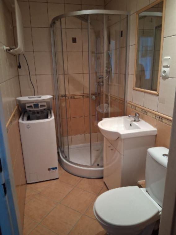 – Łazienka z kabiną prysznicową i pralką,