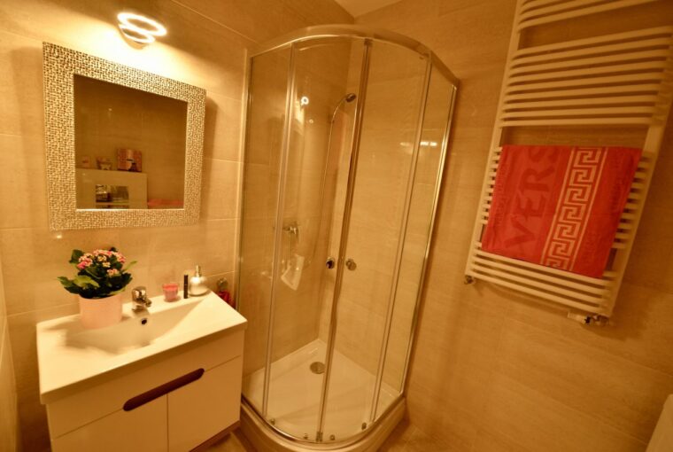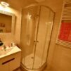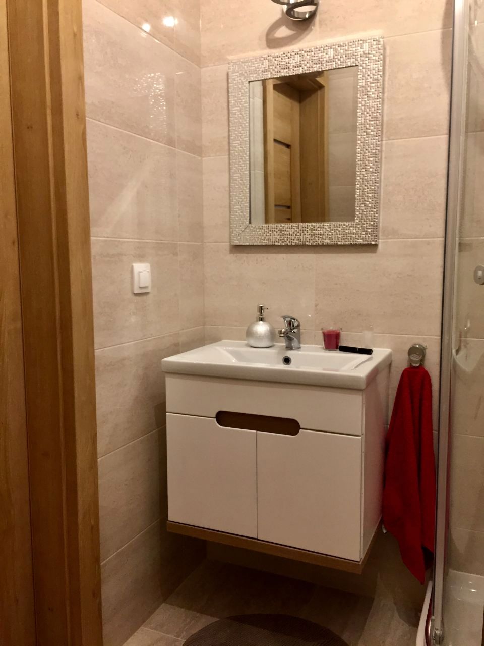W łazience kabina prysznicowa, umywalka z wiszącą szafką oraz pralka.