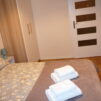 Przytulnej sypialni: duże łóżko i szafa w zabudowie,,