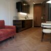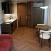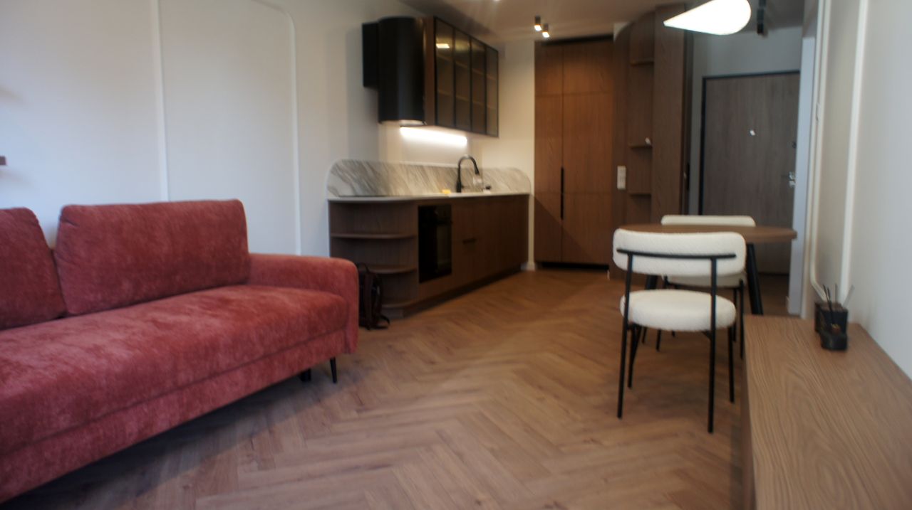 – Z salonu połączonego z kuchnią, kanapa rozkładana, stół z krzesłami, lodówka, zmywarka, płyta grzewcza, piekarnik,