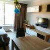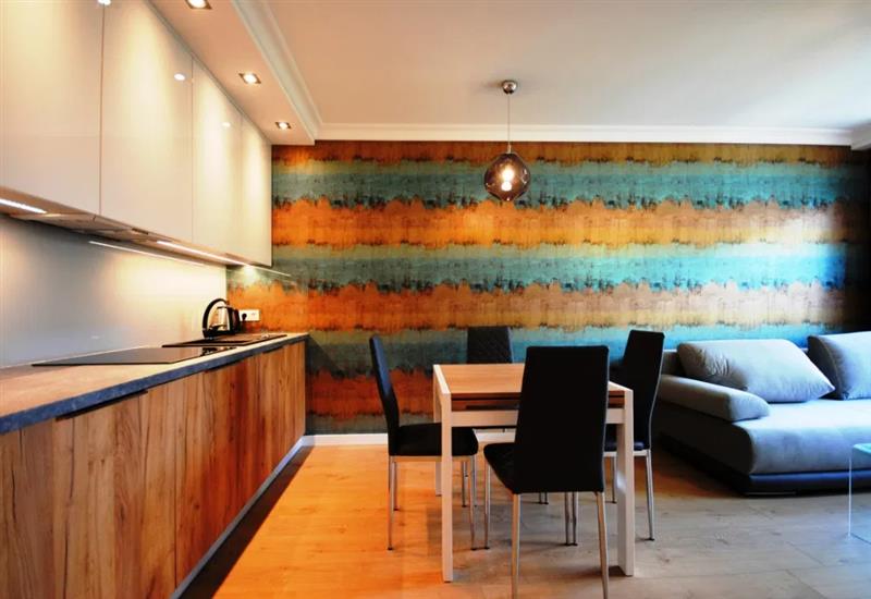 Aneks kuchenny zawiera wszystkie niezbędne sprzęty (m .in. lodówka, płyta, okap, piekarnik, mikrofala, zmywarka, czajnik elektryczny).