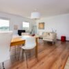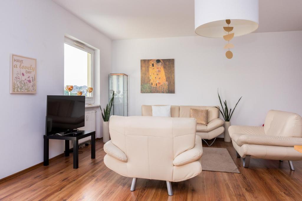 Przestronny salon z aneksem kuchennym: z telewizorem z płaskim ekranem, aneks kuchenny ze standardowym wyposażeniem, lodówka, zmywarka itp,